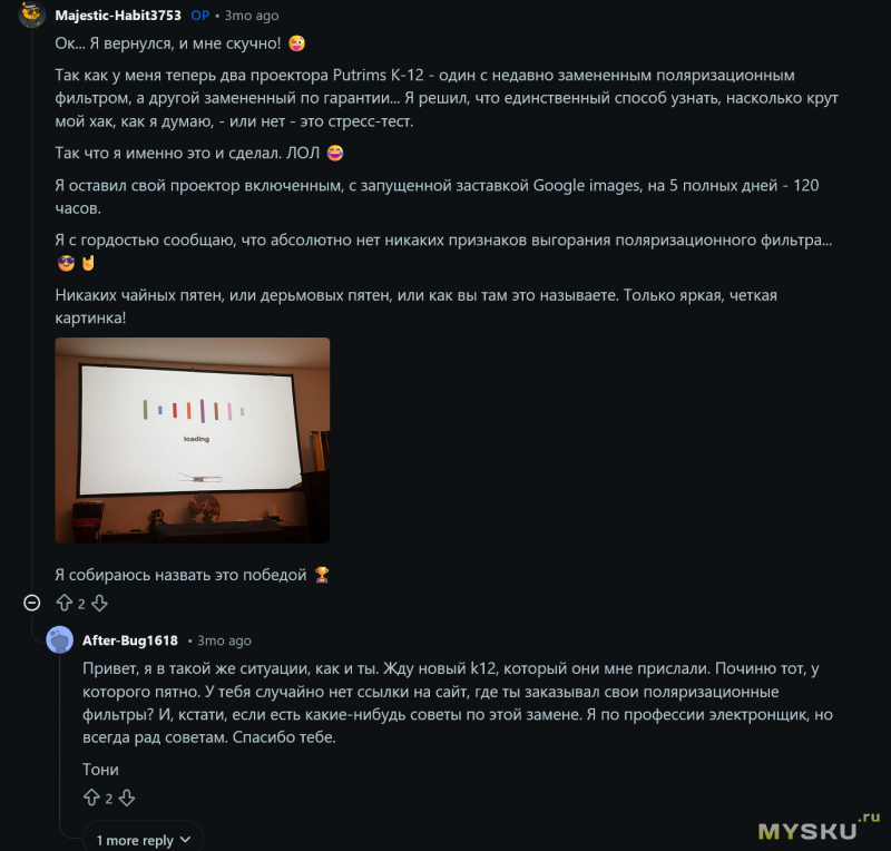 пс напоминаю, что кадры сделаны при освещении 3 лампочки по 10Вт (у меня комната 15кв.м), диагональ экрана 2м
