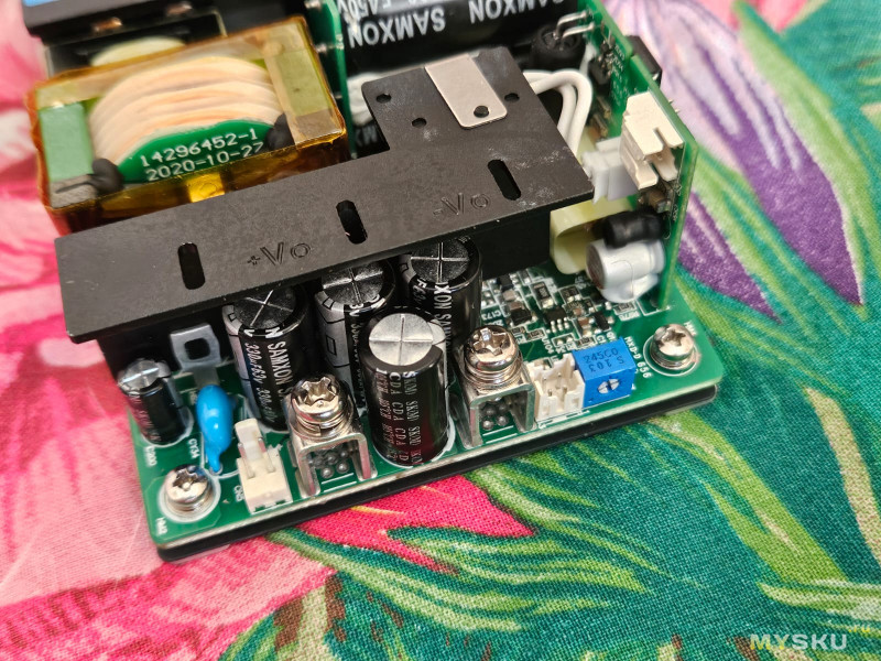 Имеется фильтрующий дроссель, после которого стоит ещё один конденсатор 47 мкФ 63 В.