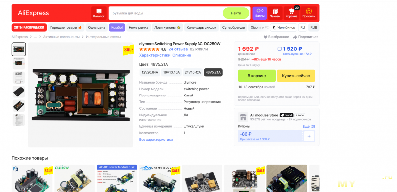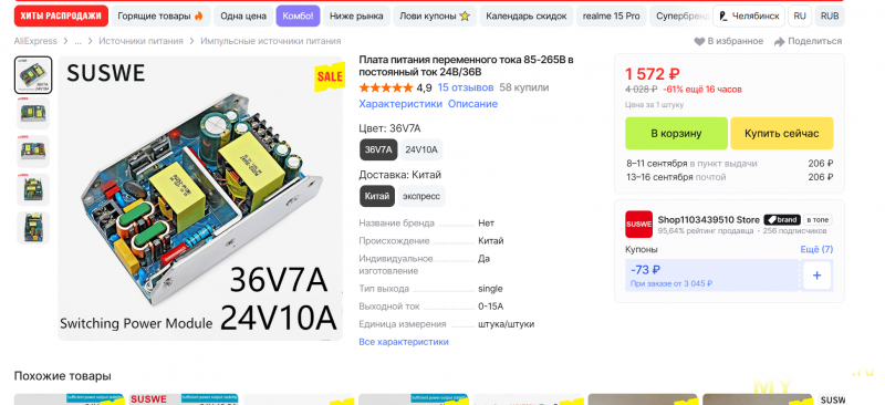 Кроме этого, в продаже есть версии на 19 и 54 В. Также, существуют разные варианты исполнения, например, с синхронным выпрямителем по выходу, с полимерными выходными конденсаторами, с заливкой герметиком, в корпусе с крышкой и тд. Наиболее богатый выбор моделей на Таобао, там такие БП продаются примерно по 90-100 юаней (без учёта стоимости доставки).