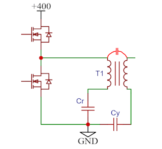 2.1 Зачем нужен большой ток намагничивания? Греть окружающую среду и плеваться более высоким уровнем EMI? С большим уровнем тока намагничивания нужны ключи с меньшим уровнем Rds(on), чтобы уменьшить потери Джоуля-Ленца на ключах. Ключ с меньшим уровнем Rds(on) имеет большие уровень Co(er) и trr, что приводит к необходимости увеличивать мёртвое время. Мёртвое время — зло для ЧИМ преобразователя, но необходимо, ибо времени на рассасывания заряда в паразитном медленном обратном диоде ключей не хватает за такт. Так как ключи работают в режиме ZVS, то примерно до 1/3 такта осцилляции к каналу ключа приложено обратное напряжение и через паразитный диод ключа протекает прямой ток. Потом остаётся ещё 2/3 такта, когда ключ открыт и потом мёртвое время… Вот этого суммарного времени может и нехватить на рассасывание заряда и запирание паразитного диода до момента открытия уже на следующем такте второго ключа. Приходится ставить дорогостоящие ключи с низкими уровнями Co(er) и trr или вообще GaN-ключи. Только вот зачем всё это, если можно использовать мостовую схему с в два раза меньшим уровнем тока намагничивания и применять ключи с большим уровнем Rds(on), но с малым уровнями Co(er) и trr? Причём такие ключи будут дешёвыми.
