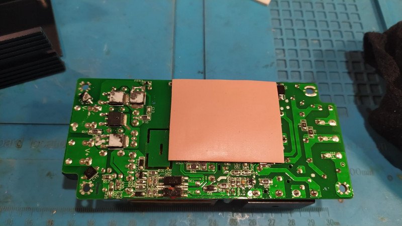 Нижняя стороны платы покрыта защитным лаком, на элементы силовой части наклеена толстая термопрокладка, через которую тепло отводится на радиатор.