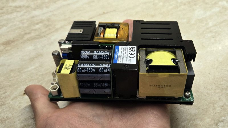 — Он тихий. На ночь я не ставлю его на максимальную мощность, на которой он абсолютно не требует обдува. Но даже с накладным вентилятором он бесшумный с расстояния два метра на полной мощности. Всё что я делал с этим БП «из коробки» — наклеил на дно, которое является радиатором, силиконовые прозрачные ножки. Всё.
