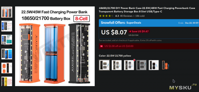 У дочери телефон известной фирмы. Не андроид. Сидит в нём непрерывно в сети. При отрыве от розетки требуется допинг. Решил решить (ха-ха) проблему малой кровью. Посмотрим, что получится… На самом деле взял второй ради посмотреть, что внутри. Цвет противоположный, чтоб не перепутать при разборке. И выяснить, почему здесь нет PD на 20 вольт, ведь у аналогичного комплекта аккумуляторов mysku.club/blog/aliexpress/103082.html он есть… Для разбора взял в чёрном корпусе — меньше видно следы от вскрытия. Отгадайте, какой пришёл? Конечно белый. Ладно — буду получать стресс. Вскрыть думал снизу — как и предыдущего. Но при внимательном осмотре заметил небольшую щель на боковой поверхности. Бить буду в неё.