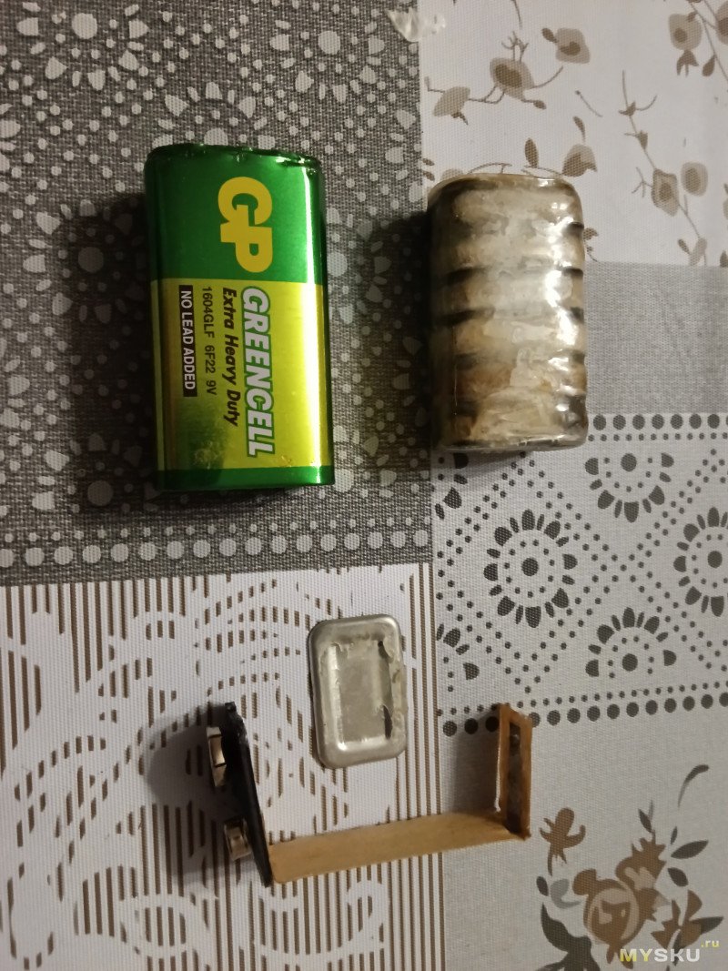 Питается чувак от батареек «Крона», в моём случае — солевая 6F22 (PP3) 9V «Космос» (35 руб.), для эпизодического использования мне кажется её достаточно.