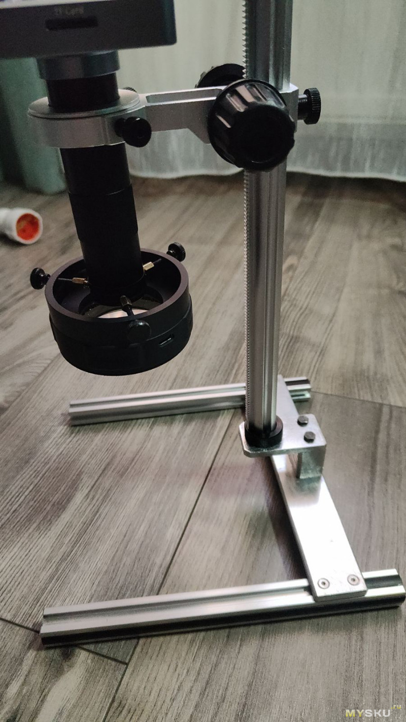 Основа под штатив и подсветка в процесе. Прилично по качеству (пример плата 9 на7 мм ), обектив 150х, рабочая висота до 30 см.