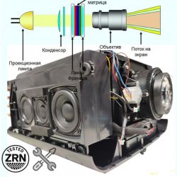 лампа → линза Френеля → жк матрица → линза Френеля → зеркало → линза → экран