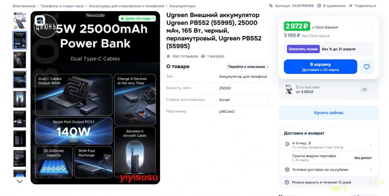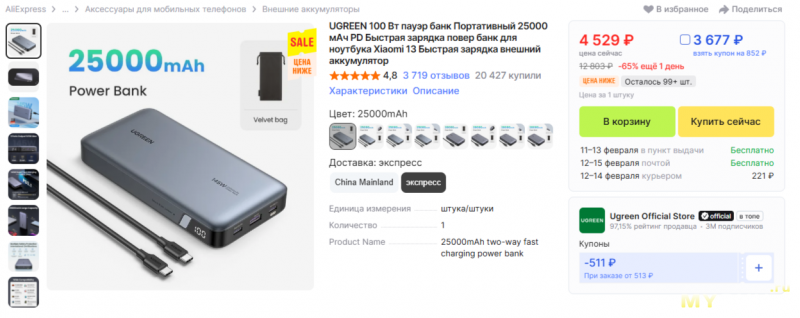 Очень вовремя повербанк от компании Ugreen — PB552, P/N 55995, да ещё и с уже встроенными кабелями 65W и 140W для PD3.1 — не будут лишними, освобождает от необходимости дополнять комплект ещё чем-то со стороны, а в дополнение к удобству использования, один из кабелей ещё и «темляком» для переноски…