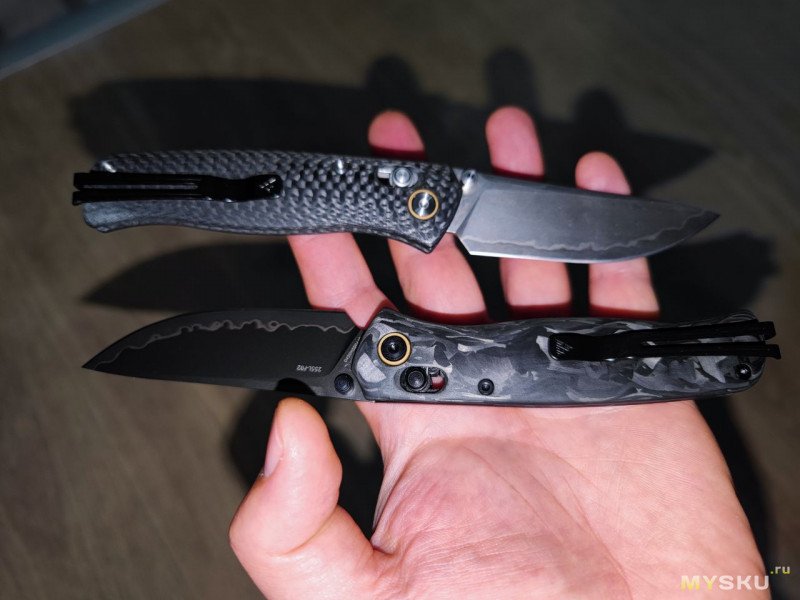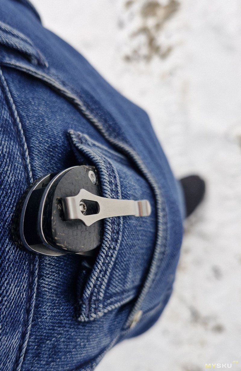 Материал рукоятки на первый взгляд смотрится грубовато, плетение напоминает карбоновое волокно (но тут ткань и эпоксидка). Но она гладкая и не склонна впитывать влагу. Спейсер из такого же материала. Центровка клинка без вопросов.Для эстетов у бренда есть и ультем.