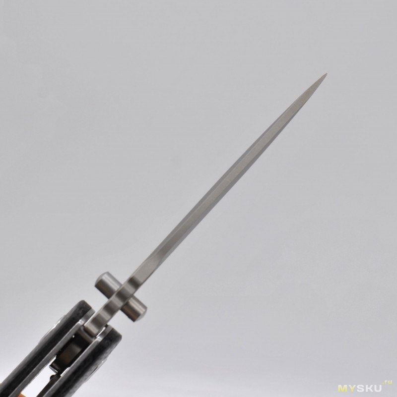 Тут классический клинок Drop‑Point (угол «капли» острия клинка 68 градусов), у обуха голомень с фасками. Покрытие клинка: матовое (сатинирование). Двухсторонний шпенек (диаметр 5,5 мм, выступает на 6 мм) гладкий.Сведение равномерное по всей режущей кромке (0,6 мм).