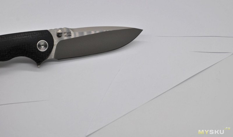 бумагу резать с таким мощным клинком можно, но не очень удобно. Но заточка FT101 из коробки хорошая: