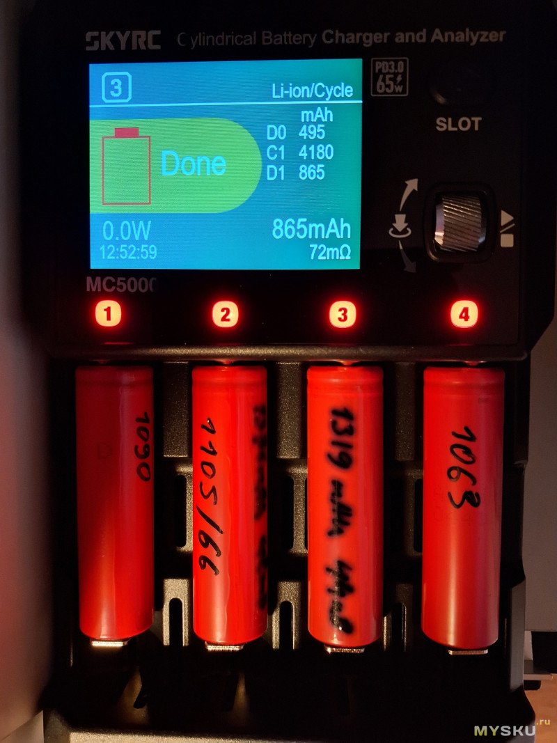 В итоге после нескольких циклов зарядки и разрядки, часов через 15-20 устройство пишет done и показывает емкость аккумулятора.