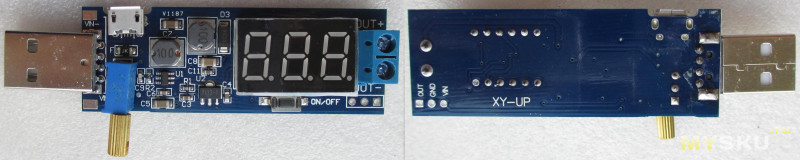 p.s. у данного преобразователя есть родственник, с большим диапазоном выходных напряжений, клеммником на выходе, регулировкой многооборотным подстроечным резистором и индикатором напряжения.
