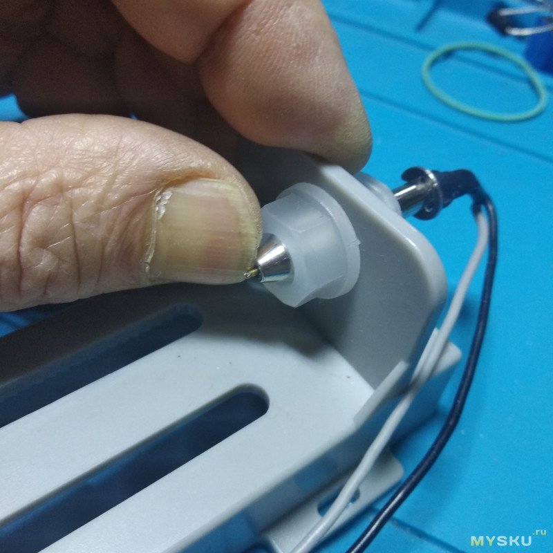 А для тока там «здоровенный кольцевой электрод». Так это на фото здоровенный, на самом деле менее 4 мм колечко белого металла, площадь контакта мала и не подпружинено.