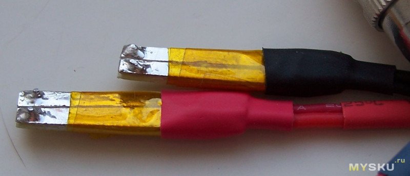 С учётом тока 5 А (мВ делил на 5) оно оказалось 0,32 мОм, вставил между ними медную ленту 0,1 мм, пошевелил, — 0,68 мОм, вставил латунную ленту 0,1 мм — 3,3 мОм.Промерил сопротивление от минусового контакта до конца провода 12AWG (~20 см) — 32 мОм, у плюсового — 22,6 мОм.
