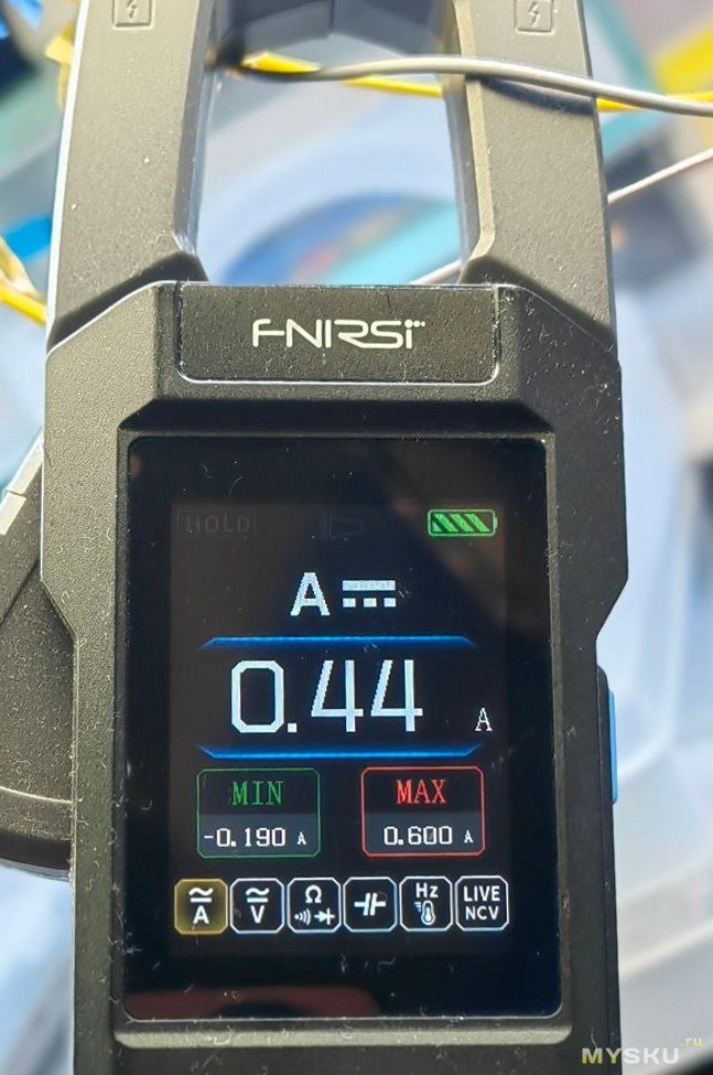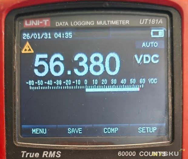 Ток измерял на общем проводе от двух зон, получился 0.44 А, напряжение на одной зоне 56.3 В
