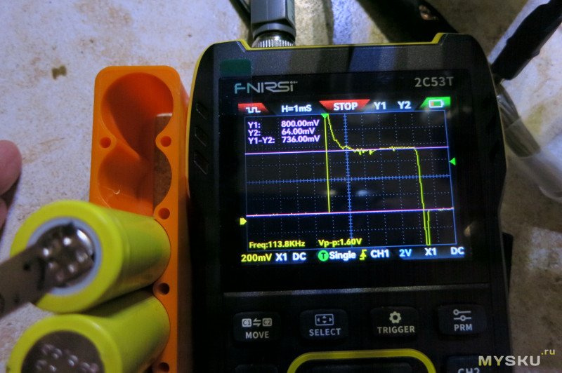 Ну и измеренная амплитуда сигнала 736мВ, сопротивление участка провода, к которому был подключён осциллограф, 0,3мОм. 736мВ/0,3мОм=2453А.