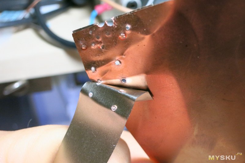 Держится так себе.Есть у меня кусочек меди 0,17мм, пробую приварить его.
