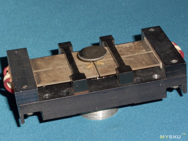 Четыре пьезоэлемента позволяют качать зеркальце по двум осям благодаря обратному пьезоэффекту. На сколько микрон — вопрос интересный, но я его так и не собрался выяснить, поскольку судя по толщине пьезопластин, напряжения в этой штуке должны были быть на уровне сотен вольт. А ведь тоже прибрал в барахолку с дальним «прицелом» лазером засветить.