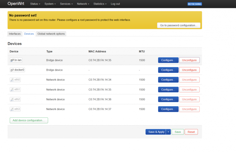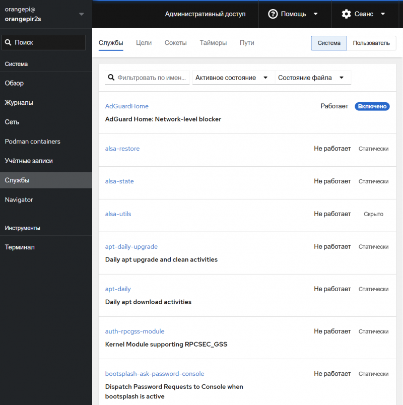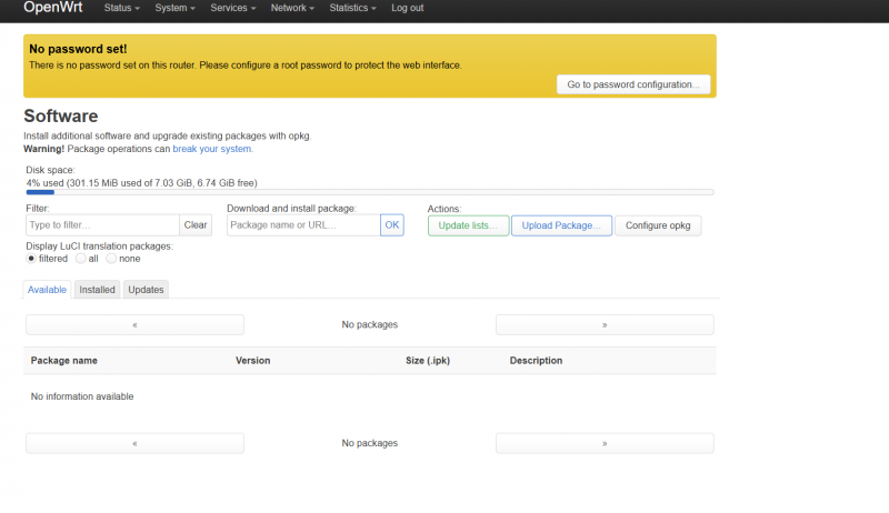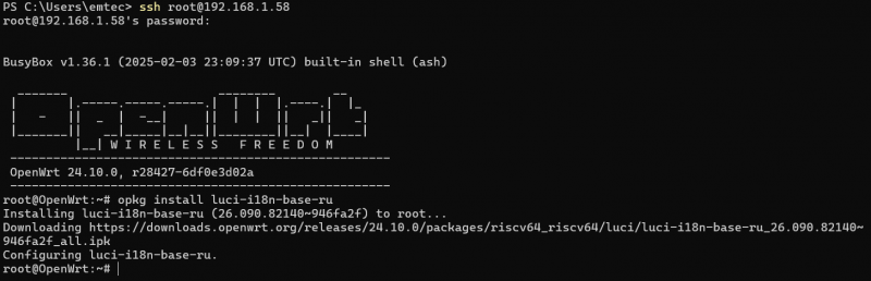 Интерфейс доступен «из коробки» на английском языке. Через SSH можно доустанавливать пакеты и локализацию.