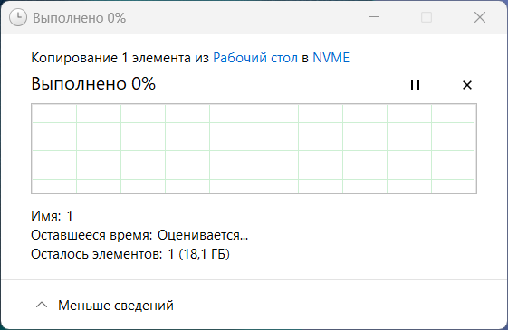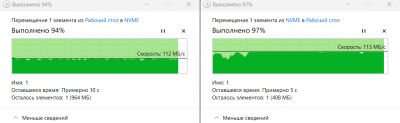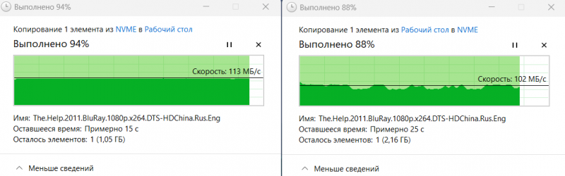 К сожалению, у меня нет сетевой карты 2.5G, поэтому тестировал скорость на гигабите. Считывание происходит сразу с ровной скоростью, а вот запись специфична: файл начинает передаваться, но визуально процесс «оценивается», хотя к диску обращение идёт, затем начинается стабильная передача с небольшим проседанием в конце.