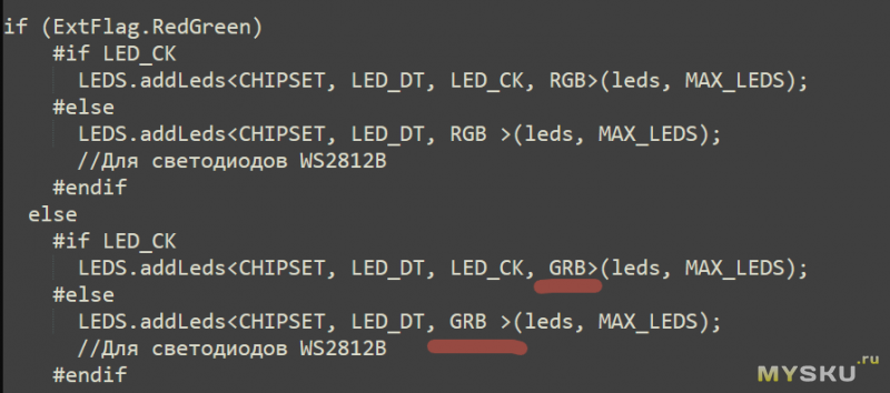 У Вас есть возможность менять два цвета. Я столкнулся с проблемой, что в моей ленте очередность BGR. По итогу пришлось поиском искать по всему скетчу «RGB» и менять на «BRG».