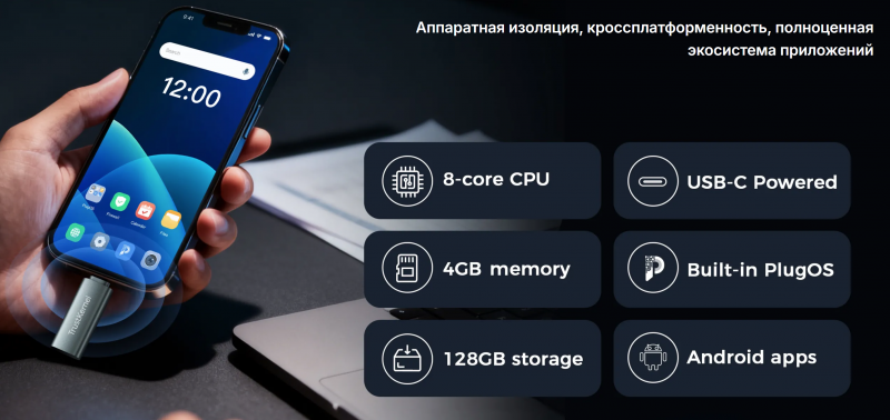 PlugMate — это стик/флешка с мини компьютером на PlugOS (по сути оболочке вокруг Андроид), которая защищает информацию внутри и позволяет запустить Андроид на вин/мак или на другом смартфоне. Но отдельно и с доступом внутрь лишь верифицированным пользователям.