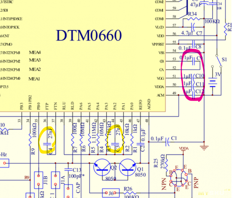 удлинение писка вызывается зарядом у источника тестового напряжения. ставлю на тех, что выделены красным, там по замерам чет многовато ёмкости.