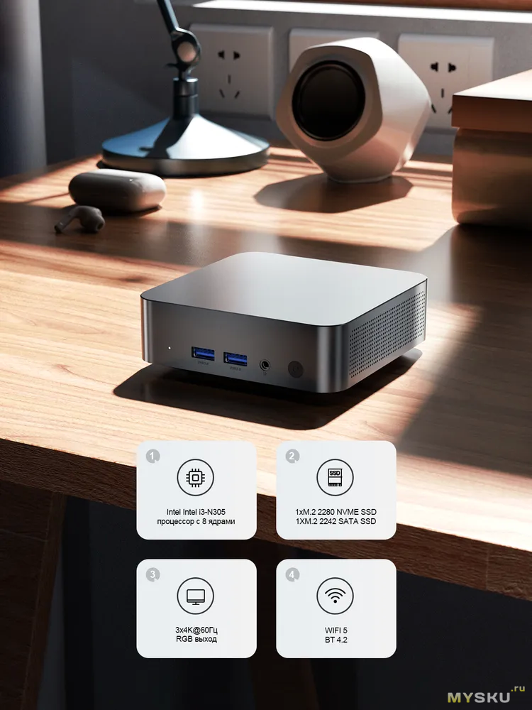 Мини-ПК на ЦП 4 ядра Intel Core i3-N305 (без ОЗУ и SSD), графика Intel UHD (вывод на три монитора), корпус 110х110х31 мм. 2 SSD, активное охлаждение ЦП. Питание можно подавать по Type-C.