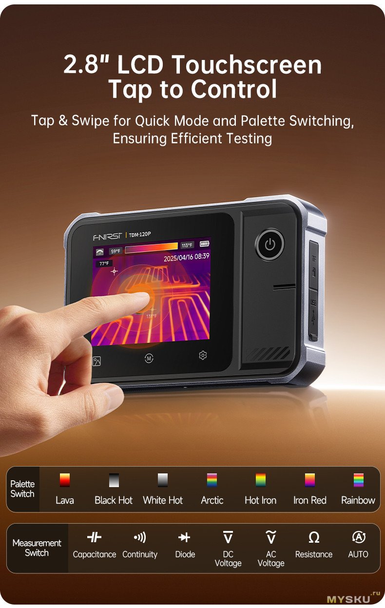 Новинка от FNIRSI. Комбинированный прибор 2-в-1, сочетает тепловизор с разрешением 120×90 и 25 Гц ( ‒20°C до 400°C) + TRMS мультиметр на 19999 отсчетов. Сенсорный экран 2,8 дюйма, USB экспорт файлов, слот под карту микро SD, аккумулятор 1500 мАч.