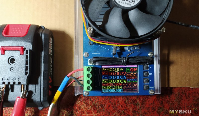 Эта электронная нагрузка имеет 4-х проводное подключение. Но в данном случае мне это не очень нужно, поэтому обойдусь двумя проводами.