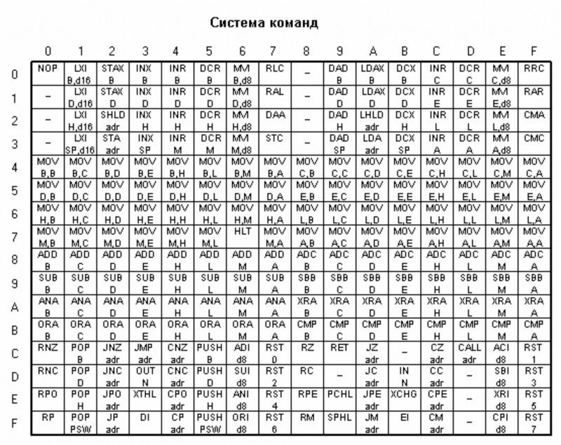 Он же был полностью обратно совместим с 8080, а для допкоманд были задействованы несколько неиспользованных байт, вот где у 8080 прочерки: