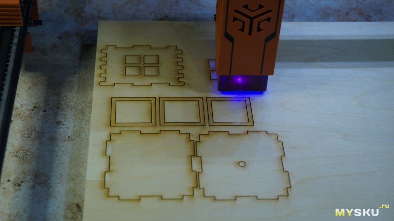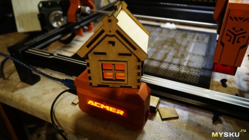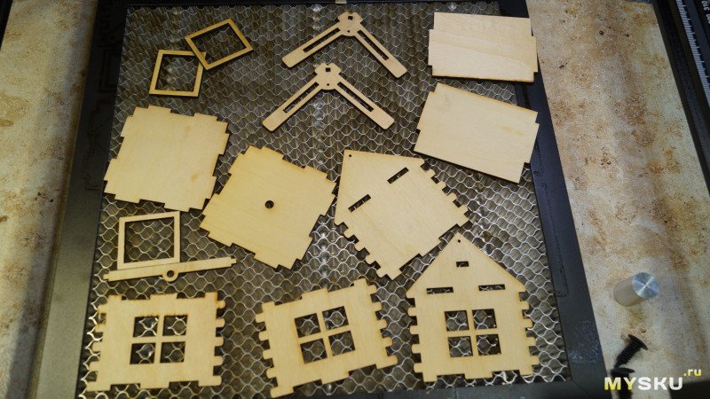 Крыша собрана просто паз в паз. На деталях чуть видны темные следы. Это говорит о том, что у производителя мощный лазер и хороший обдув, место реза почти чистое.