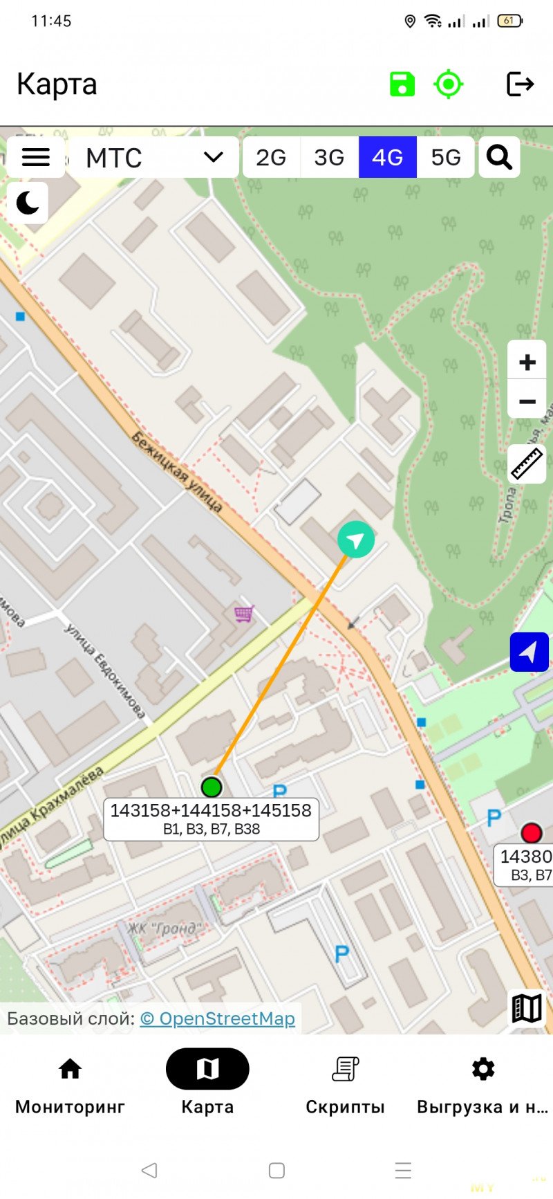 Стрелка показывает направление от моего дома до скопления вышек, среди которых есть работающие. Примерное расстояние до них 5-8 км. Интернет от станций, которые рядом заглушен. В приложении видим на каких частотах работают станции. Это В3 (1800 МГц) и В7 (2600 МГц). Наша цель выбрать вышку, сигнал с которой не будет забиваться на выбранной частоте ближайшими станциями с заглушенным интернетом. У МТС заглушенные вышки 143160 и 143128 не позволяют пробиться на частоте В3, В7. А вот у Теле2 видно, что при выборе частоты В7 и отключении в настройках модема частоты В3 есть возможность подключиться.
