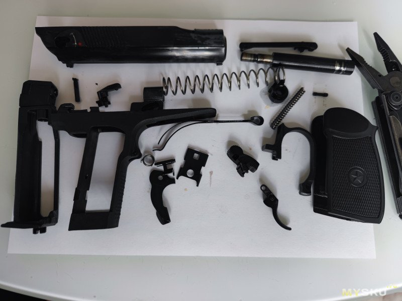 Но доступ к нужной мне резиночке так и не появился. Печаль: придётся половинить пистолет. Чтобы его располовинить, нужно снять накладки с рукоятки. Если положить пистолет рукояткой к себе, а стволом вправо, будут видны болты, которыми скреплены половины — их 9 штук. Располовиниваем аккуратно: там 5 пружинок (на бойке, на курке, на кнопке извлечения магазина, в основании рукоятки и рядом с курком — крепится к тяге от курка к бойку).