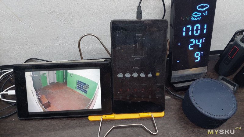 Так же были сомнения по поводу софта — не будет ли виснуть, вылетать и т.д. — без проблем. Как уже писал ранее, моя версия несколько иная и ориентирована на умный дом, часть данных я беру со своих датчиков, обновляются они сразу и т.д. Так вот, есть у меня еще и камера, которая висит над входной дверью. Когда размышлял по поводу информера, пришла идея задействовать и ее. После тестов стало понятно, что это возможно. Киллер-фича моего информера в том, что он, по совместительству, еще и видеодомофон. Одним выстрелом убил кучу зайцев. Когда возникает такая комбинация идей и возможностей — готов пойти на самый сомнительные действия. Так вот, информер может сутки напролет крутить видео с камеры, а потом, по тапу, перейти в режим отображения погоды и спокойно продолжить работу, и так месяцами — это к теме о стабильности, надежности и легкости.