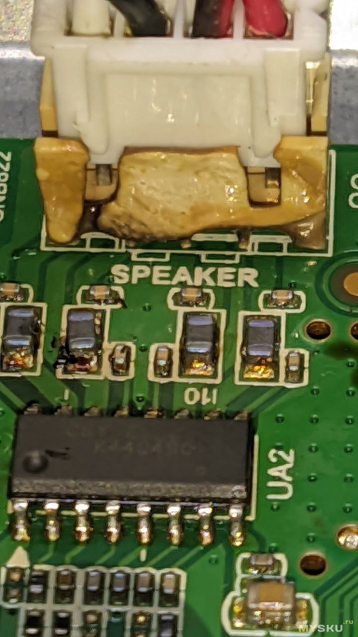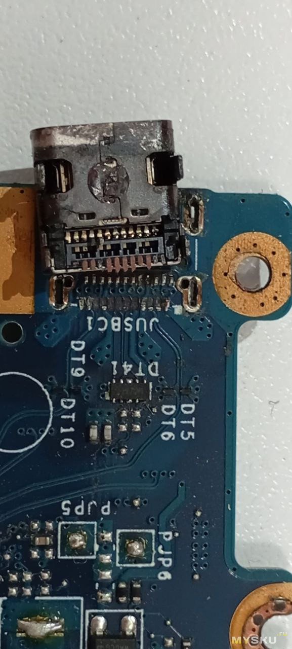 Вижу, что прошлый мастер старался, добавил много флюса, но его мастерства не хватило, чтоб припаять разъем. Или может припой у него был просроченный, не знаю.