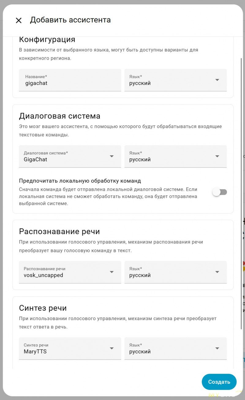 Модель выбираем Gigachat, температуру на свой вкус(чем выше — тем сильнее железка будет бредить). Остальные галки можно поснимать — они нам не нужны.Дальше нам нужно создать нового голосового ассистента, который будет использовать в качестве движка гигачат, а не HA. Идём в Настройки->Голосовые Ассистенты->Добавить Ассистента
