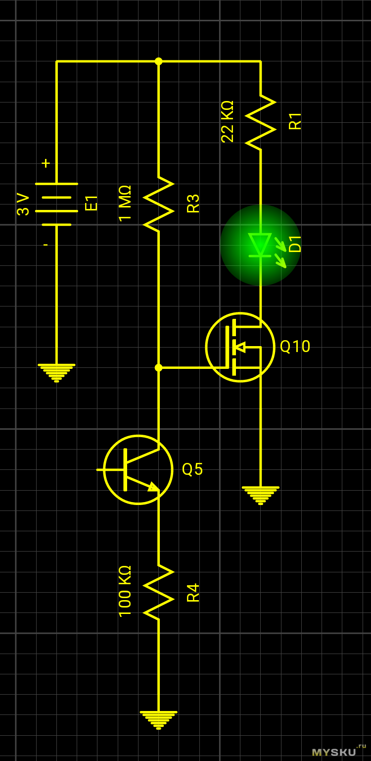 Для организации постоянной подсветки, параллельно транзистору ставится резистор Rпп (на схеме показан пунктиром), через который питается светодиод LED когда транзистор Q2 закрытый. На фото полосатый выводной резистор, припаян между коллектором транзистора и минусом питания: