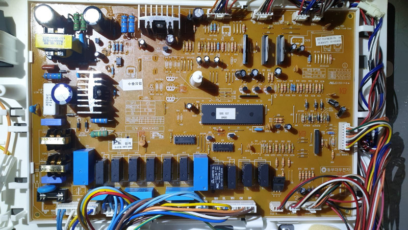 По всем признакам, виноват был датчик температуры, но я ж не первый день живу, поэтому взял осцил и потыкал на выход импульсного БП платы управления, увидел там жуть по пульсациям (а мультиметр показывал норму), отрубил его (он там собран прямо на огромной материнке вместе со всем остальным барахлом, включая контроллер, снимать и чинить — очень длинная песня), припаял параллельно отдельный БП на 15В — и всё заработало.