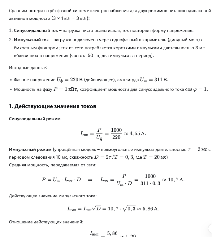 … для трехфазной системы с нагрузкой 1 кВт на фазу, при синусоидальном токе потери в проводах (линейных) и обмотках трансформатора определяются действующим током ~4.55 А (при 220 В). При импульсном токе (длительность 3 мс, скважность 0.3) действующее значение тока возрастает до ~5.9 А, что увеличивает потери в активном сопротивлении в (5.9/4.55)^2 ≈ 1.68 раза. Кроме того, из-за высших гармоник эквивалентное сопротивление проводов и обмоток возрастает (скин-эффект, эффект близости) — для трансформатора это может дать дополнительное увеличение потерь в 1.2-1.5 раза, так что суммарные потери в меди трансформатора могут возрасти в 2-2.5 раза. Потери в стали трансформатора практически не меняются. Потери в нулевом проводе (если он есть) могут возрасти значительно (в несколько раз) из-за токов третьей гармоники. В целом, импульсный режим существенно ухудшает энергоэффективность системы.