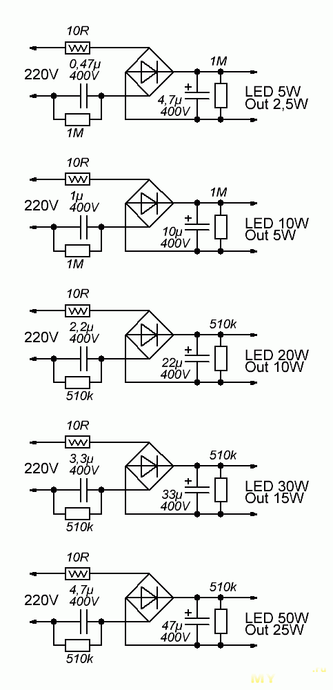 Изделия разных разработчиков отличаются разными значениями емкости конденсаторов C1 и C2, и даже какой-то из них (или оба) могут отсуствовать. От этого зависит уровень пульсаций света.