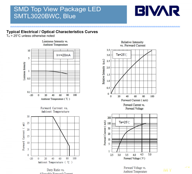 Возьмём к примеру диод Bivar Inc. (USA) — SMTL3020BWC (даташит, PDF) и мы видим что после +20 яркость свечения снижается, а так же что зависимость "прямой ток — яркость" так же нелинейная: