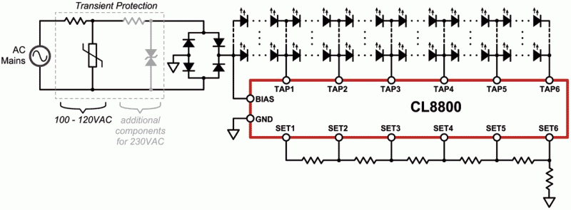 На рисунке упрощенная схема LED прожекторов и лампочек, имеющих в своем составе светодиодный драйвер. Который по сути импульсный стабилизатор тока питания светодиодов.