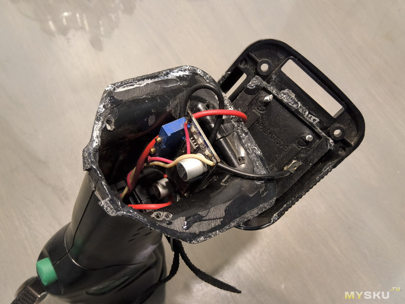 Осталось вывести индикатор заряда на корпус, и докончить уже эту комедию. Для этого я взял большой красный светодиод, и вывел его тонкими проводами на корпус, закрепив термоклеем.