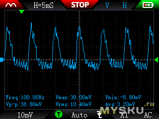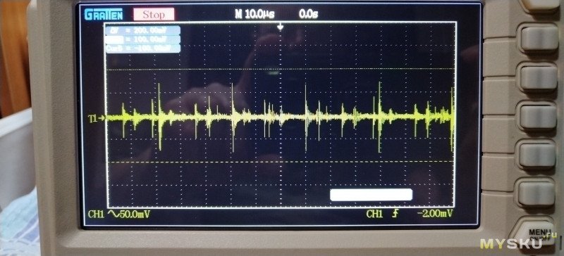 Видим иголочки шумов примерно 10мВ размахом, а у мелкого осцила не хватает чуйки)