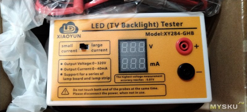 Кстати, интересную вещь увидел — если подключить к прибору светодиодную ленту с неисправным диодом и начать повышать напряжение, часто неисправный диод внутри где-то начинает пробивать, и он тоже начинает светиться, только очень слабо. Таким образом можно его легко найти.