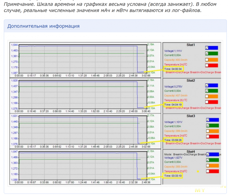 Вторая (информационная) ступенька в наличии. После ее окончания напряжение отрубается контроллером и МС3000 прекращает запись. Поэтому продолжение кривой «в ноль» на графиках отсутствует.Примечание. Шкала времени на графиках весьма условна (всегда занижает). В любом случае, реальные численные значения мАч и мВтч вытягиваются из лог-файлов.
