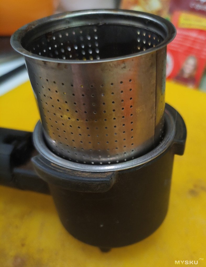 Корзина для отработанной таблетки кофейной гущи. По ее форме и влажности оценивают правильность приготовления кофе. Сухая и плотная таблетка — признак нормы, а мокрая или разваливающаяся указывает на неправильный помол и темперовку.