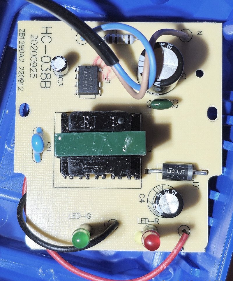 Есть два диода индикации процесса — красный (заряжается) и зеленый (окончен или не подключен).