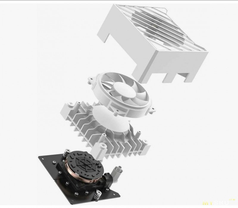 На водоблоке большой 72 мм вентилятор, который дополнительно охлаждает и помпу и пространство вокруг, хорошо дует во все четыре стороны- достаётся и памяти и VRM и даже вниз на видеокарту поток долетает. Вентилятор PWM, подключен у меня на отдельный 4pin шум на расстоянии 0,5 м примерно 36 dB